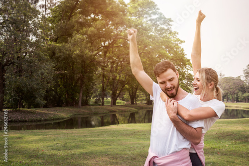 Challenge Success Couple Raising Hands For Fitness Goal
