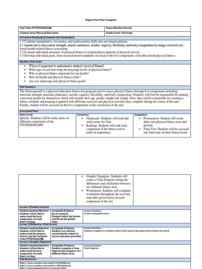 Digital Unit Plan Template Physical Fitness Test Assessment